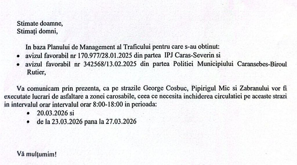 În perioada 20 martie 2026 și între 23 și 27 martie 2026, traficul rutier va fi restricționat pe străzile George Coșbuc, Pipirigul Mic și Zăbranului din Caransebeș, pentru efectuarea lucrărilor de asfaltare.