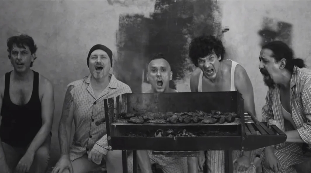 Filmat în alb-negru, clipul îi prezintă pe Tudor Chirilă şi colegii de trupă pierzându-şi minţile în faţa camerei şi devenind saltimbancii de colţul blocului. Cu mască sau fără mască, ei consumă bere după bere, cântă la instrumente şi îşi taie măştile anti Covid. Omu Gnom încearcă să le bage minţile în cap şi să facă un comentariu dur asupra societăţii noastre şi a celor care apreciau izolarea şi au transformat-o într-un mod de viaţă.