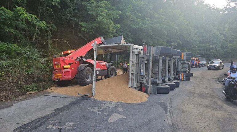 [VIDEO] Accident la Naidăș! Un autotren care transporta cereale s-a răsturnat
