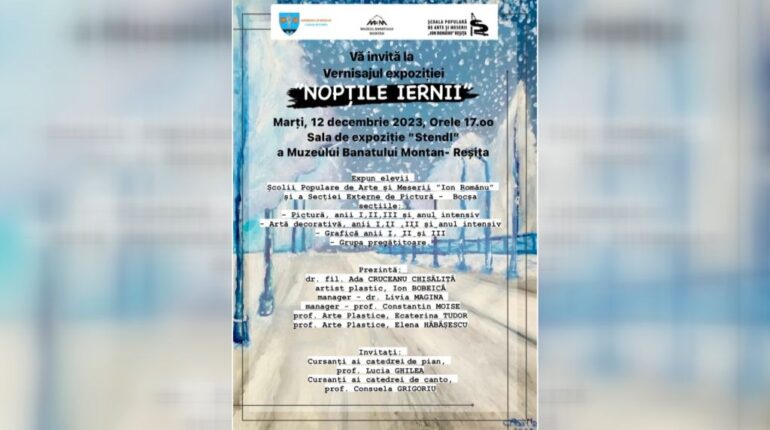 În așteptarea lui Moș Crăciun, Muzeului Banatului Montan, Reșița și Școala Populară de Arte și Meserii „Ion Românu” desfășoară marți, 12 decembrie, 2023, începând cu ora 17.00 vernisajul expoziției „NOPȚILE IERNII”, cu lucrări aparținând cursanților Școlii Populare de Arte și Meserii „Ion Românu” Reșița și ai Secției de Pictură, Bocșa. Evenimentul aduce cu el atmosfera […]