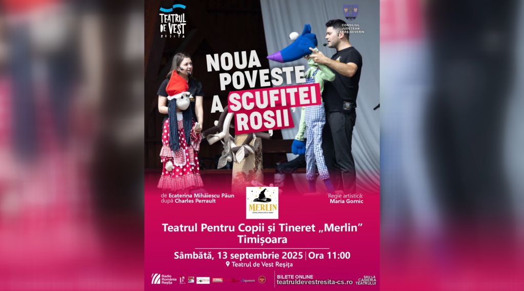 Sâmbătă, 13 septembrie, de la ora 11:00, Teatrul de Vest Reșița îi așteaptă pe cei mici, alături de părinți și bunici, la spectacolul „Noua poveste a Scufiței Roșii”, o producție de succes a Teatrului pentru Copii și Tineret Merlin Timișoara.