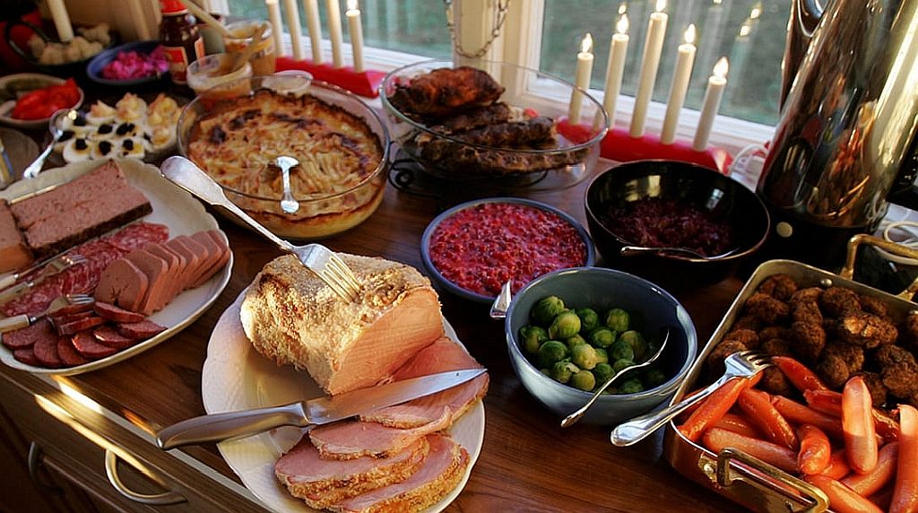 Julbord, bufetul tradiţional suedez, conţine preparate ca Jansson’s Temptation (cartofi cu anşoa), dopp i grytan (pâine cu supă de porc), lutfisk (un fel de piftie de peşte alb), risgrynsgröt (asemănător cu pilaful) şi julskinka (şunca de Crăciun), toate servite cu o bere dulce fără alcool, numită julmust.