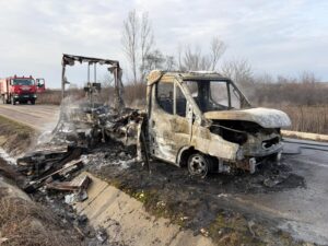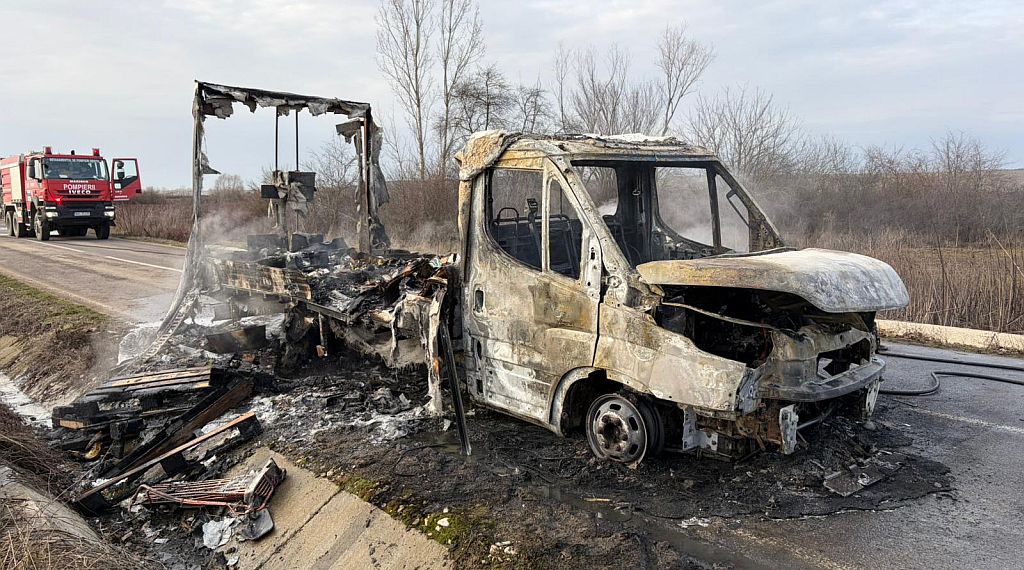 Un incendiu puternic a distrus complet o camionetă, pe drumul comunal DC 86, între localitățile Berzovia și Ramna.