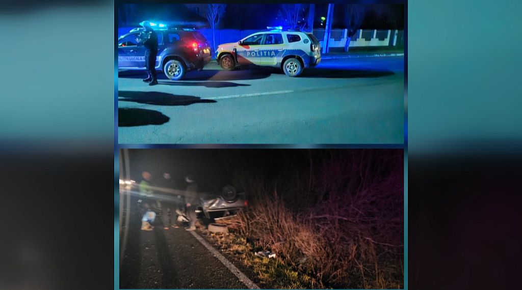 Din cauza unei depășiri neregulamentare, șoferul unei mașini a pierdut controlul și s-a răsturnat cu roțile-n sus, în afara părții carosabile.