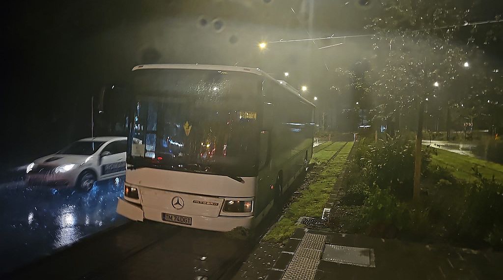 Asta după ce șoferul unui autocar, pe fondul unui carosabil umed, a pierdut controlul volanului, a ieșit din decor și s-a oprit direct în stația de tramvai.