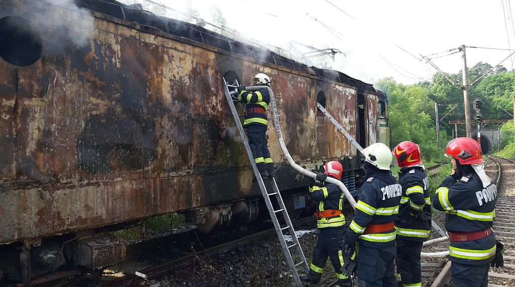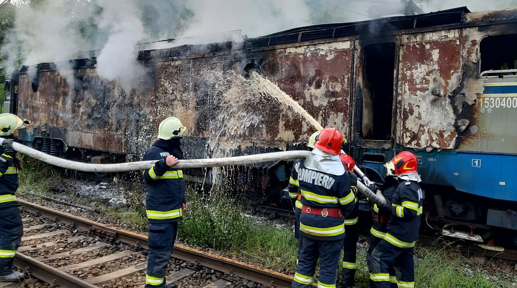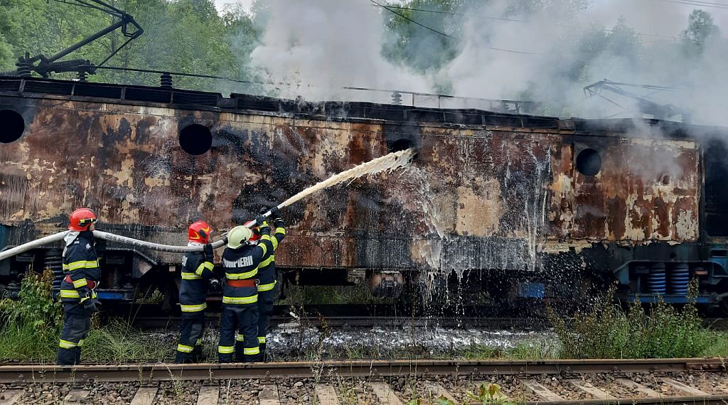 Acesta se manifesta la locomotiva trenului! Locomotiva a fost decuplată de restul garniturii de tren și îndepărtată, astfel că focul nu s-a extins și la vagoane.