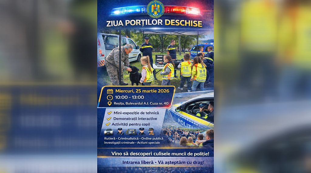 Cetățenii sunt invitați să participe miercuri, 25 martie, începând cu ora 10.00, la activitățile organizate cu ocazia Zilei Poliției Române, la sediul Inspectoratului de Poliție Județean Caraș-Severin.